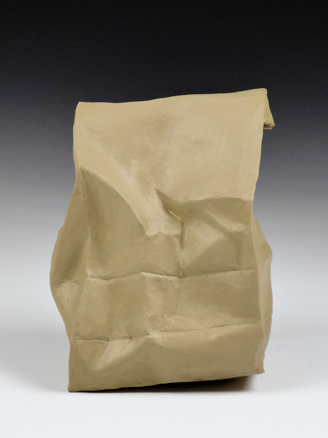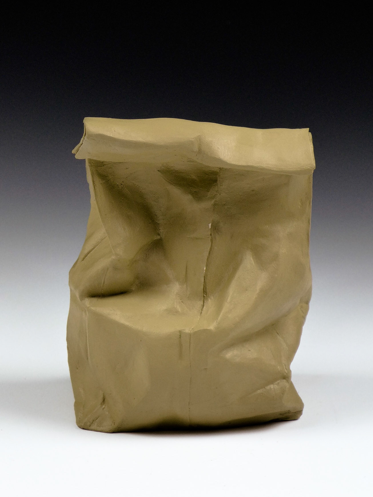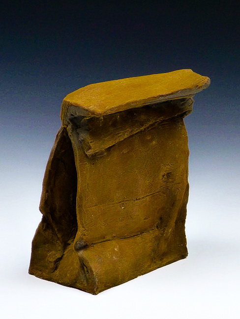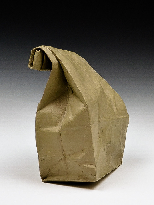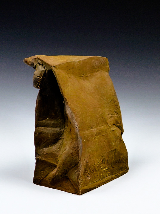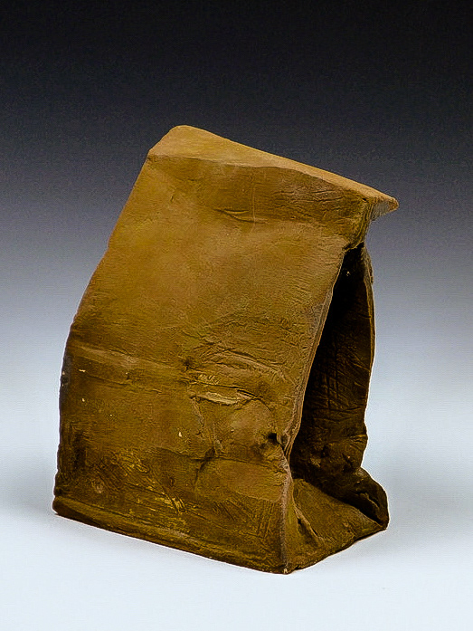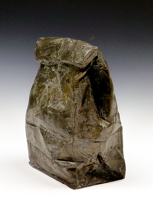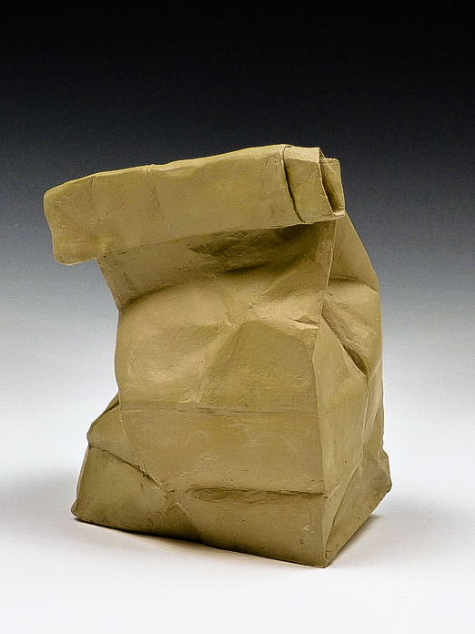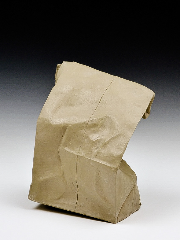This is an ongoing series examining the hard and soft edges of lunch bags rendered in clay. These trompe l'oeil paper bags have been bisqued fired then given a patina.