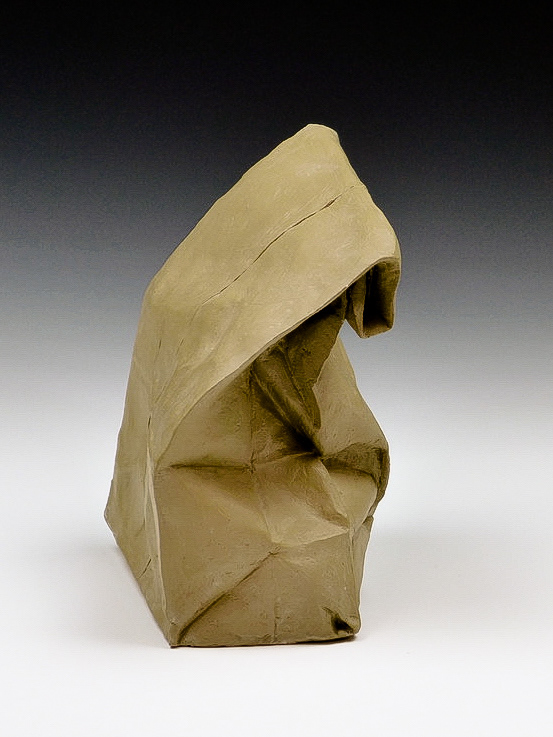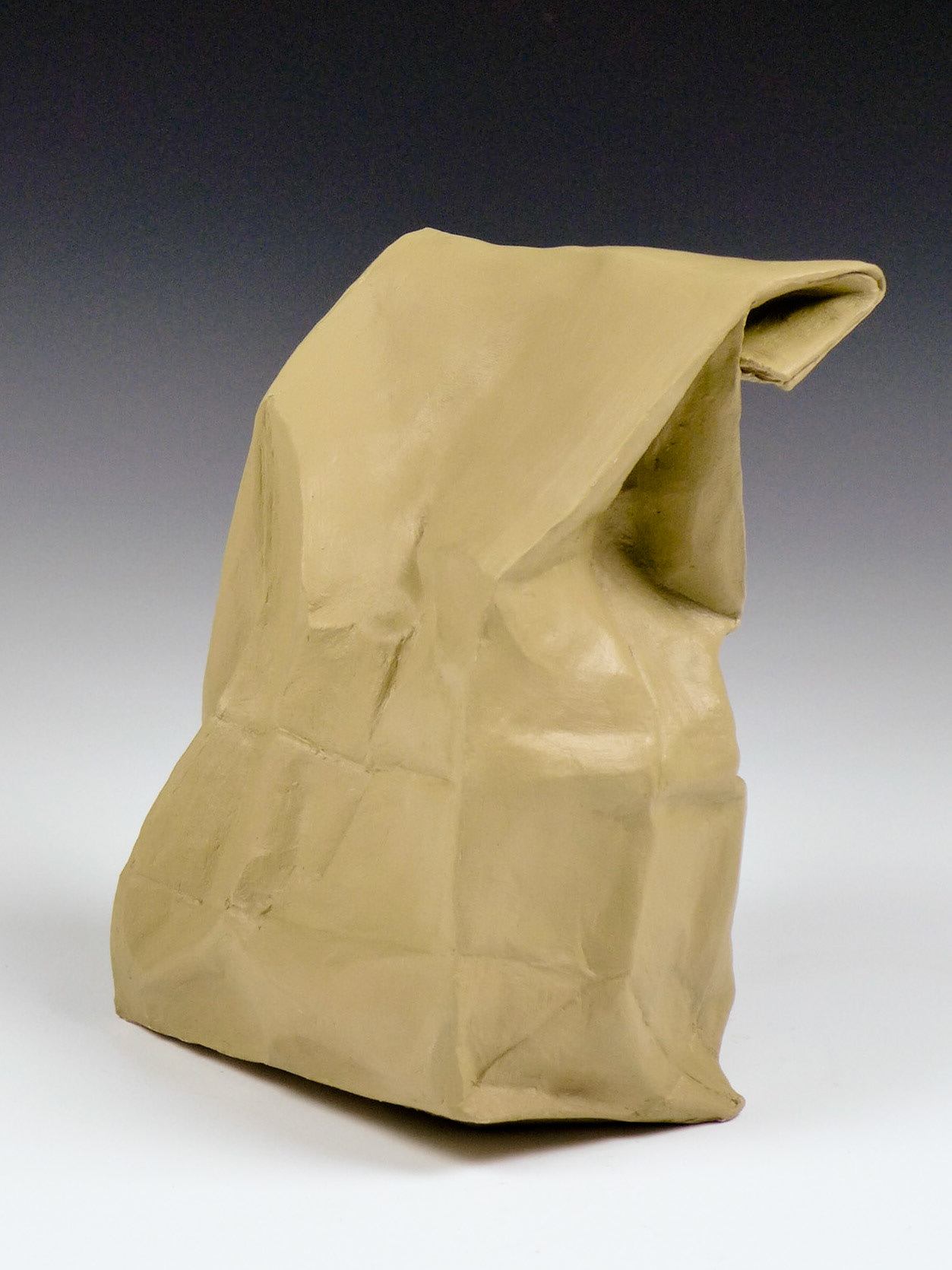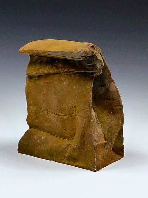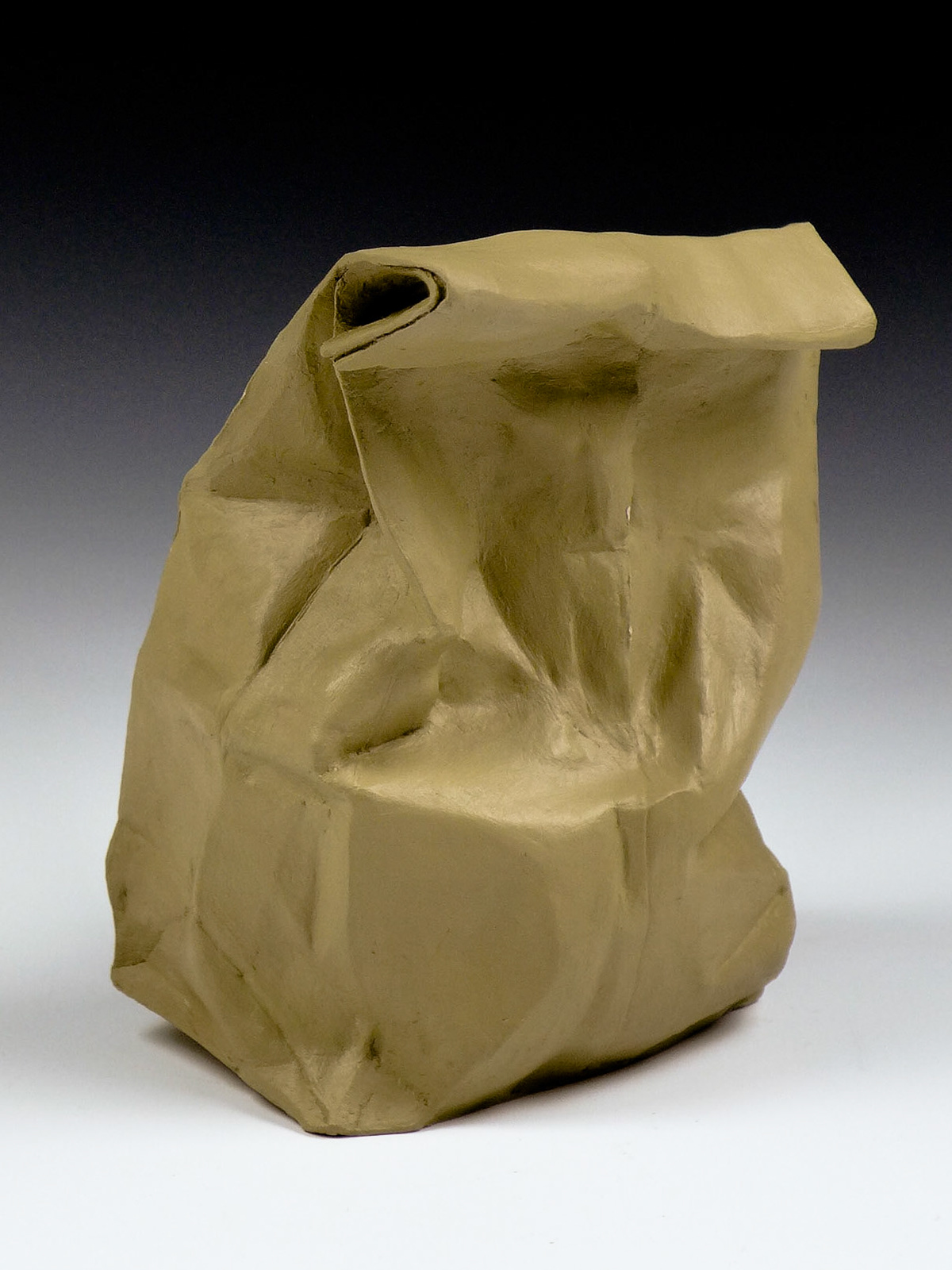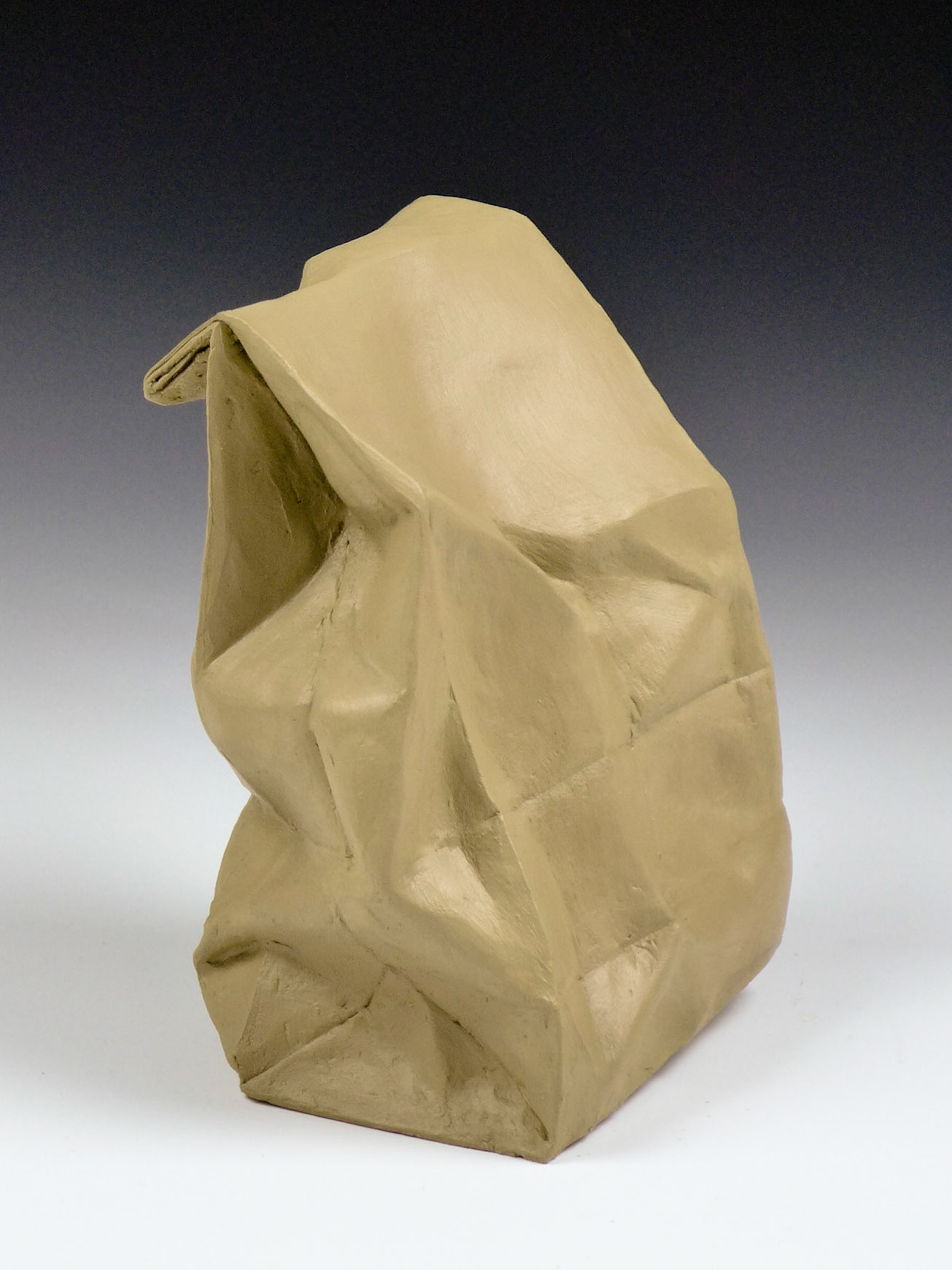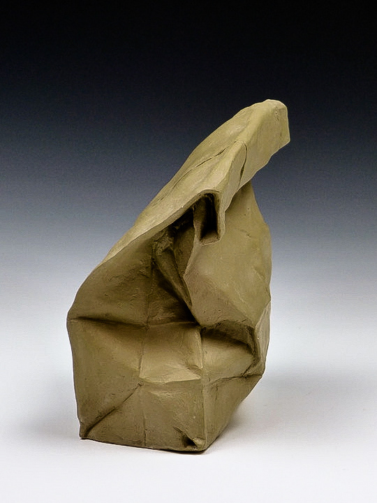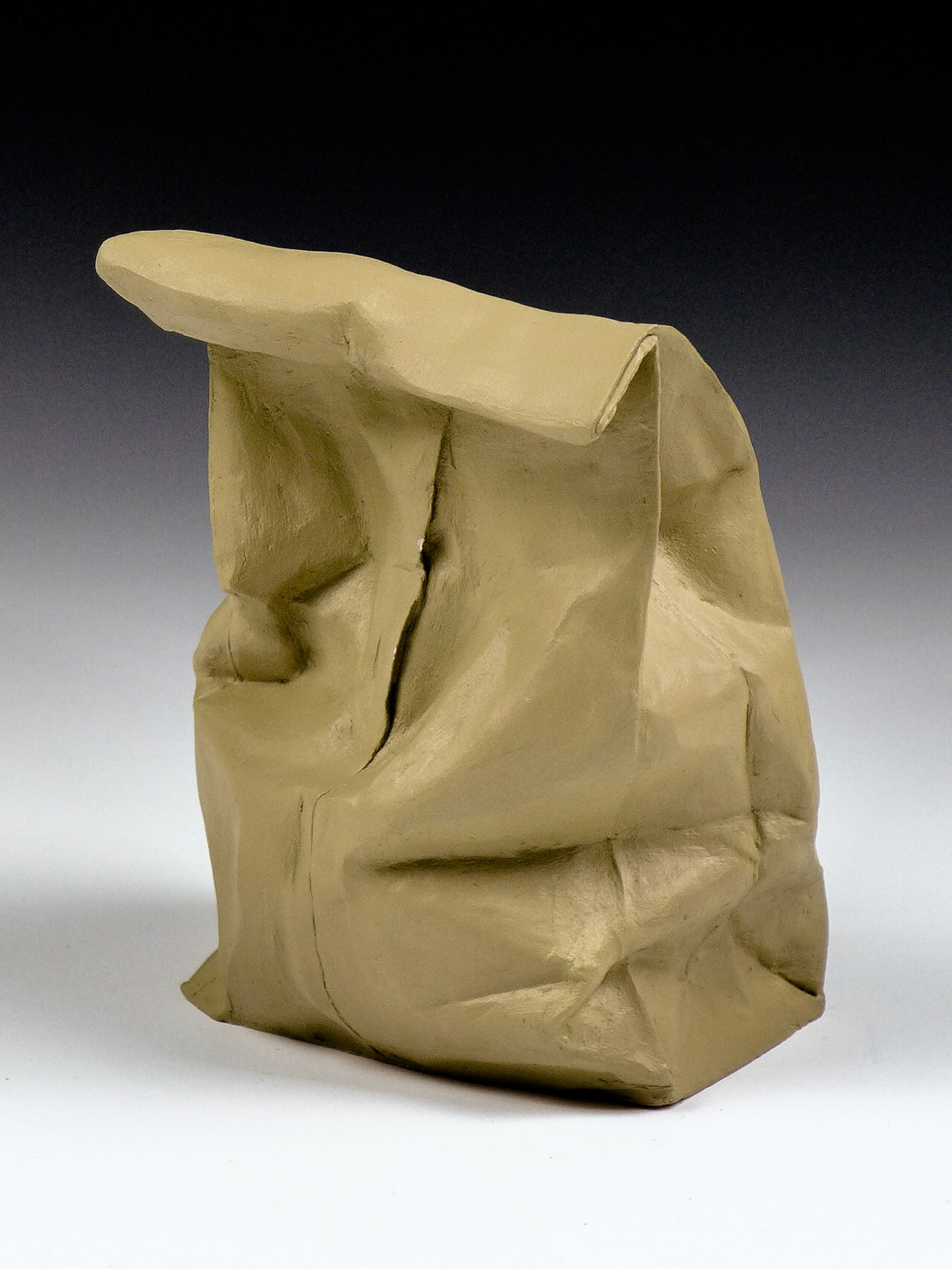 This is an ongoing series examining the hard and soft edges of lunch bags rendered in clay. These trompe l'oeil paper bags have been bisqued fired then given a patina.